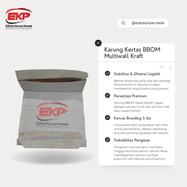 Kualitas Karung Kertas yang Edpack Karunia Persada sediakan merupakan kualitas yang terjamin. Tersedia kualitas food grade sehingga sangat aman untuk semua jenis makanan baik skala industri ataupun beverages. BBOM Multiwall Kraft Paper Sack dapat dibuat dengan Model Gusset ataupun tanpa Gusset (lipatan samping). Edpack Karunia Persada berpengalaman dalam hal penyediaan produk kemasan BBOM Multiwall Kraft Paper Sack untuk berbagai industri. Edpack Karunia Persada telah bekerjasama dengan berbagai industri baik lokal, nasional ataupun multinasional. Karung Kertas ini dapat digunakan untuk mengemas berbagai produk industri dengan berbagai bentuk produk baik tepung, bubuk, cream, bongkahan, kristal, breadcrumb, serbuk dan lain-lain.