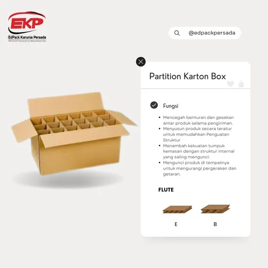 Partition Karton Box atau kotak kardus partisi merupakan solusi kemasan yang dirancang dengan sekat atau pembatas di dalam box untuk menjaga setiap produk tetap terpisah dan aman. Sistem partisi ini membantu mencegah benturan antar produk selama proses penyimpanan dan distribusi, sehingga sangat ideal digunakan untuk barang yang mudah pecah, bernilai tinggi, atau memiliki bentuk yang seragam.